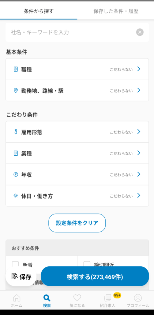 解決策の一つは【勤務地】【職種】【こだわり条件】などを細かく絞り込んで、その条件を保存しておくことです。