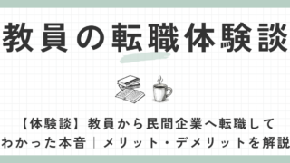 ③先生からの転職 【体験談】教員から民間企業へ転職してわかった本音|メリット・デメリットを解説 公立高校で10年勤務した元教員が、民間企業へ転職したリアルな体験談を紹介。残業・休日・年収・福利厚生・転職活動の苦労など、メリット・デメリットを正直に解説します。 2026.01.27 ③先生からの転職