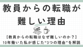 ②情報収集期 【教員からの転職はなぜ難しいのか?】10年働いた私が感じた“3つの理由”を解説 教員からの転職はなぜ難しいのか?10年学校現場で働いた私が、先生が民間へ転職しにくい3つの理由を実体験から解説します。タイミングの問題・情報の少なさ・安定を手放す不安など、先生特有の悩みを丁寧に整理しました。 2025.11.24 ②情報収集期