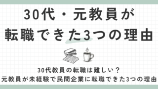 ③先生からの転職 30代教員の転職は難しい?元教員が未経験で民間企業に転職できた3つの理由 教員歴10年、未経験で30代の私が民間企業へ転職できた理由を実体験から解説。キャリアコーチング、資産1,000万円の安心感、家族のサポートなど、迷いを断ち切る3つの根拠を紹介します。教員を続けるか悩んでいる人に向けたリアルな転職記録です。 2025.12.28 ③先生からの転職