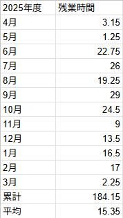 続いて民間企業に転職して1年目、2025年度の残業時間の記録です。